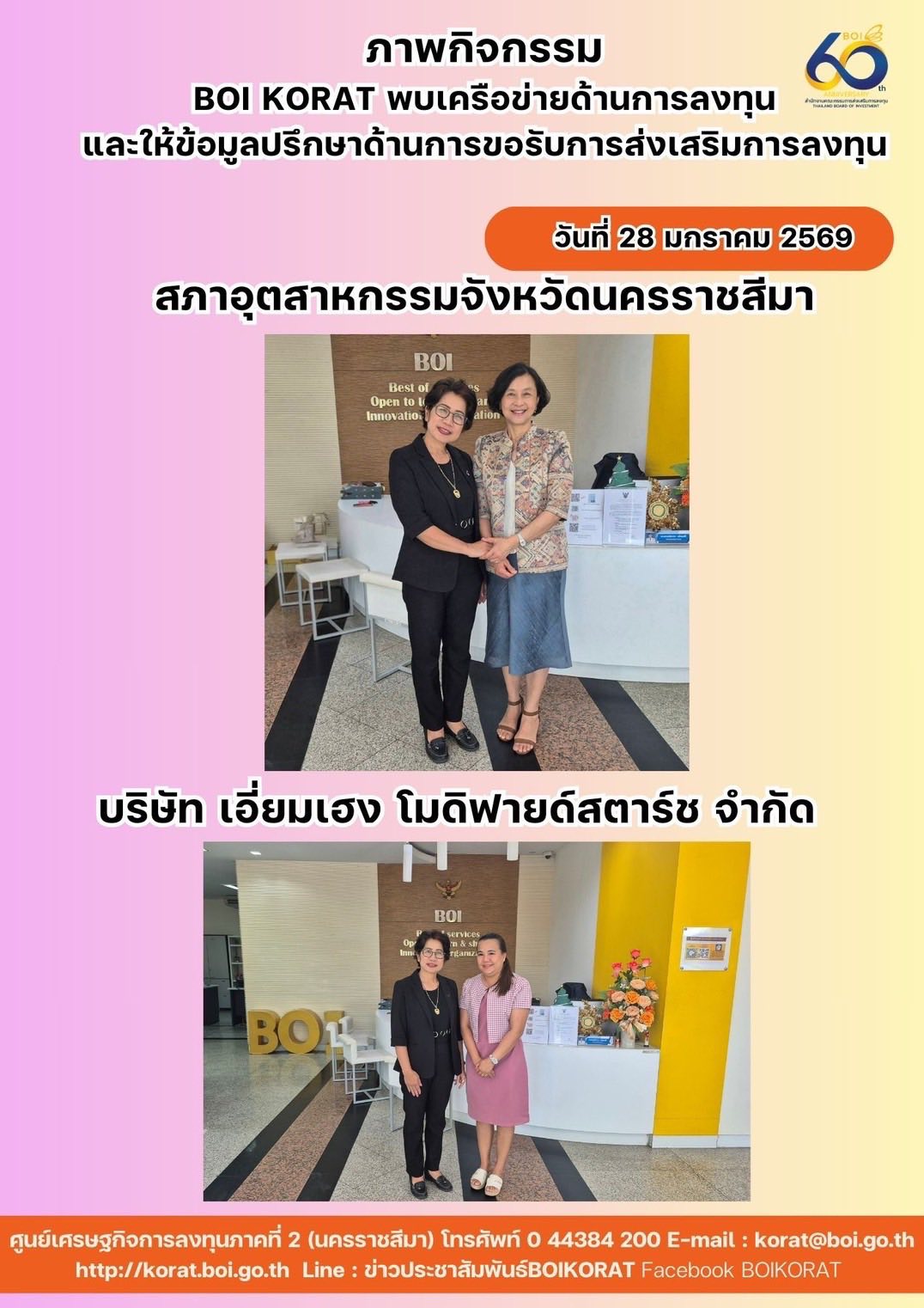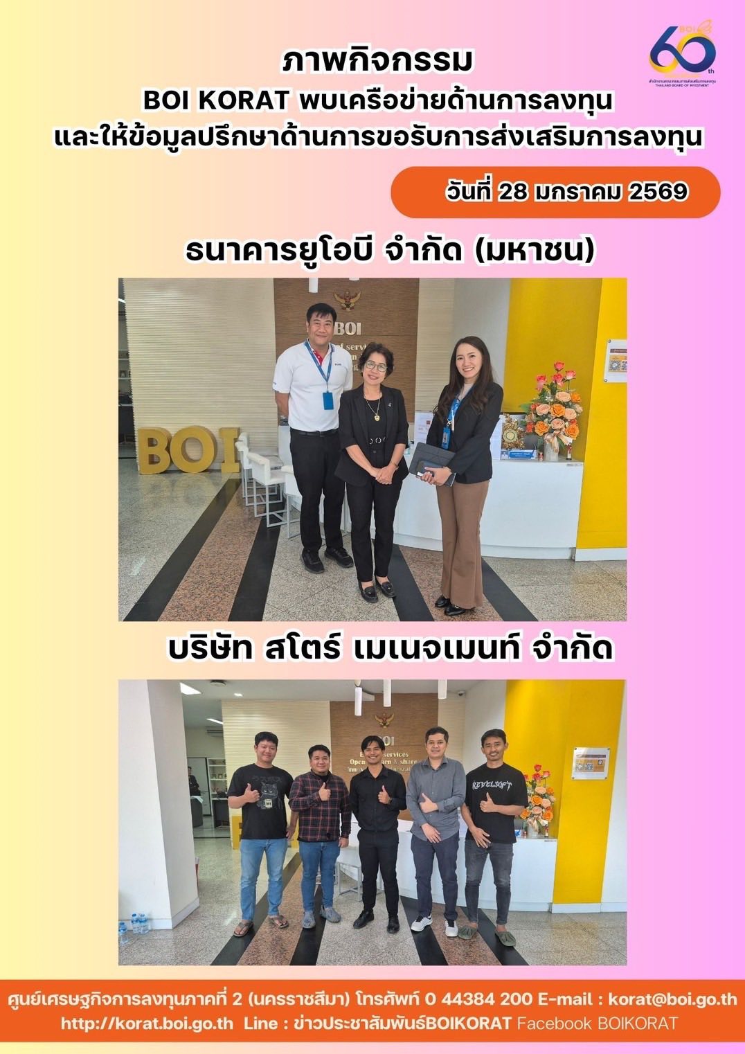 โดยได้พบกับเครือข่ายทางด้านการลงทุนและบริษัทที่ได้รับการส่งเสริมการลงทุน ในจังหวัดนครราชสีมา
