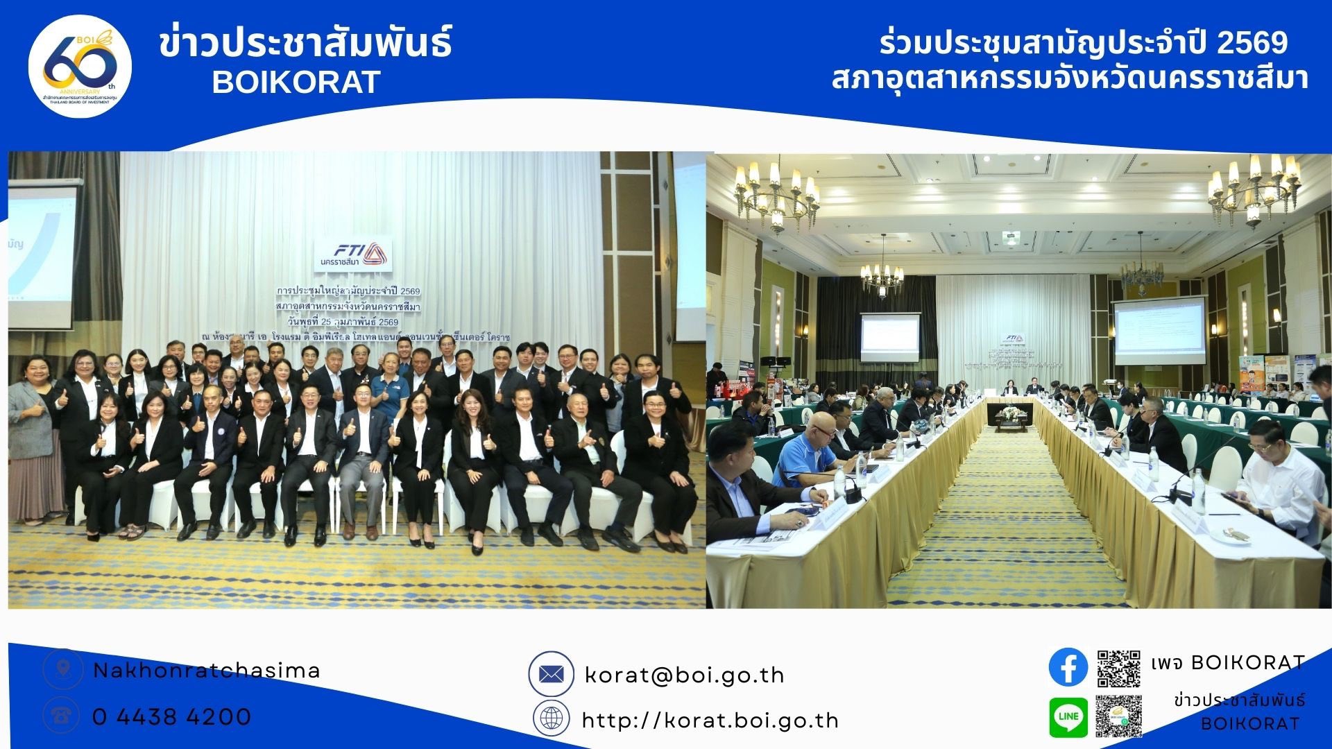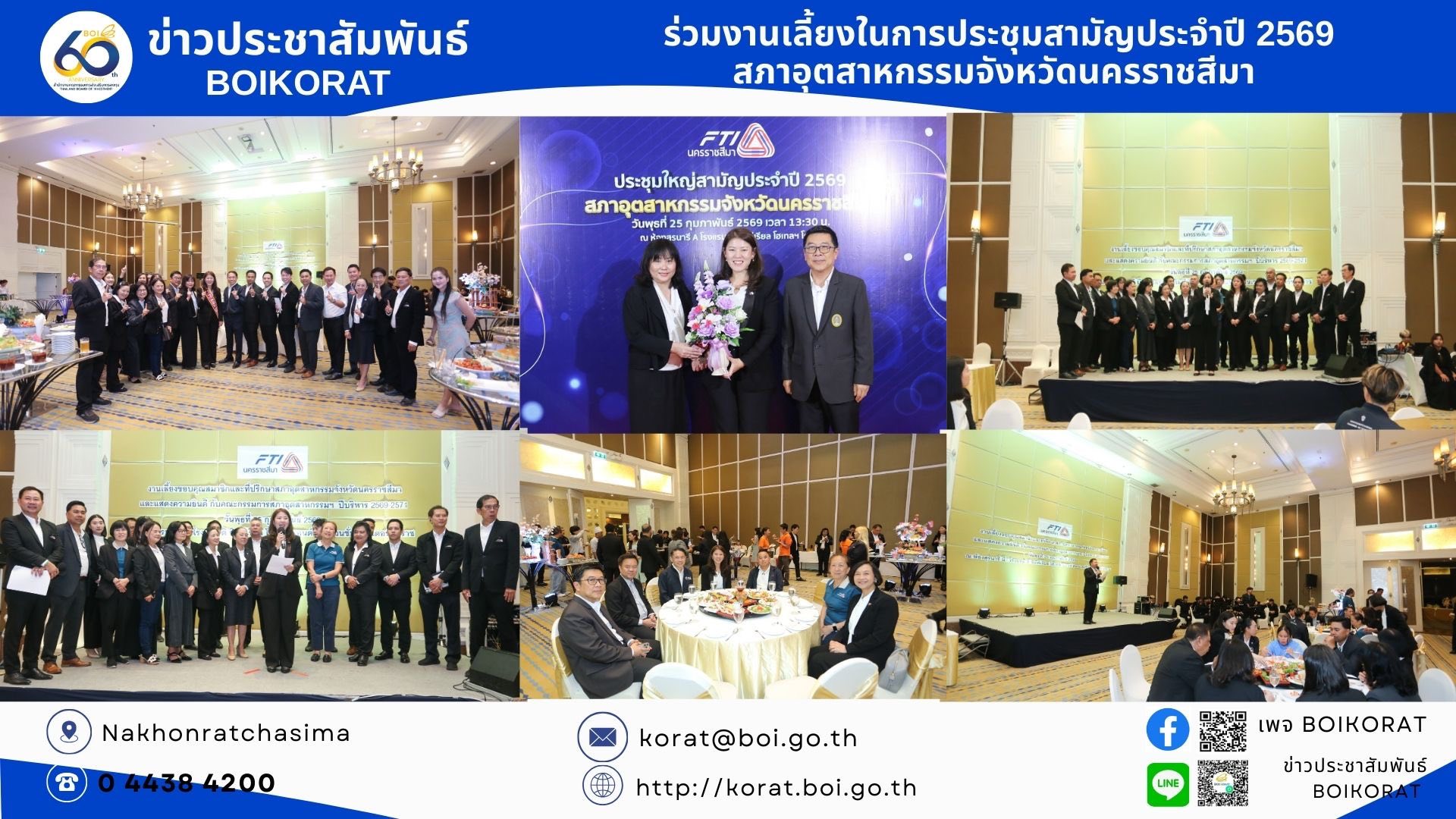 เมื่อวันที่ 25 กุมภาพันธ์ 2569 ศูนย์เศรษฐกิจการลงทุนภาคที่ 2 (BOI โคราช) เข้าร่วมกิจกรรมสำคัญในงานประชุมใหญ่สามัญประจำปี 2569 ของสภาอุตสาหกรรมจังหวัดนครราชสีมา เพื่อร่วมผลักดันยุทธศาสตร์เศรษฐกิจและสร้างความเชื่อมั่นให้แก่ภาคอุตสาหกรรมในพื้นที่ ณ ห้องสุรนารี B โรงแรมดิ อิมพีเรียล โฮเทล แอนด์ คอนเวนชั่น เซ็นเตอร์ โคราช