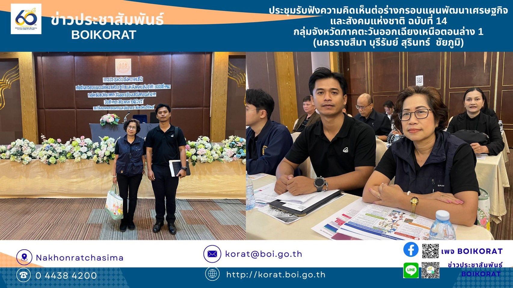 13 มีนาคม 2569วันที่ 13 มีนาคม 2569 นางสาวปุณยนุช มีกำลัง ผู้อำนวยการศูนย์เศรษฐกิจการลงทุนภาคที่ 2 พร้อมด้วยนายศักดิ์ชัย ปิ่นสันเทียะ เจ้าหน้าที่ เข้าร่วมการประชุมเพื่อรับฟังความคิดเห็นต่อร่างกรอบแผนพัฒนาเศรษฐกิจและสังคมแห่งชาติ ฉบับที่ 14 กลุ่มจังหวัดภาคตะวันออกเฉียงเหนือตอนล่าง 1 (นครราชสีมา บุรีรัมย์ สุรินทร์ ชัยภูมิ) จัดโดยสำนักงานสภาพัฒนาการเศรษฐกิจและสังคมแห่งชาติ ณ โรงแรมอัลวาเรซ จังหวัดบุรีรัมย์