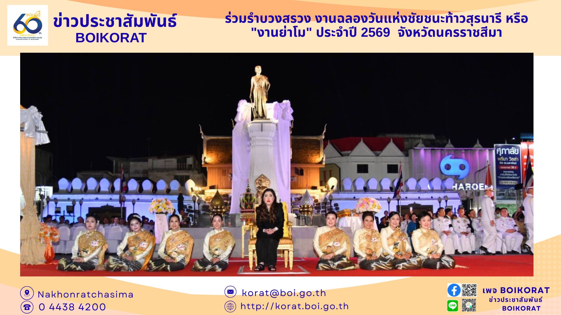 สำหรับศูนย์เศรษฐกิจการลงทุนภาคที่ 2 (นครราชสีมา) นำโดยนางอรพินทร์ ฤทธิ์ไธสง นักวิชาการส่งเสริมการลงทุนชำนาญการพิเศษ นางสาวณิชาภา ฉอ้อนศรี และนางสาวณัฐิดา พัตน์นอก เจ้าหน้าที่ เข้าร่วมรำบวงสรวงในงานพิธีเปิดงานฉลองวันแห่งชัยชนะท้าวสุรนารี หรือ "งานย่าโม" ประจำปี 2569 จังหวัดนครราชสีมา โดยงานจัดขึ้นระหว่างวันที่ 23 มีนาคม - 3 เมษายน 2569 เพื่อเทิดทูนวีรกรรมของท้าวสุรนารี วีรสตรีไทย และปลูกจิตสำนึกให้เยาวชนตระหนักถึงความกล้าหาญ เสียสละ และความรักชาติ ตลอดจนส่งเสริมการอนุรักษ์วัฒนธรรมท้องถิ่น และกระตุ้นเศรษฐกิจในระดับภูมิภาค
