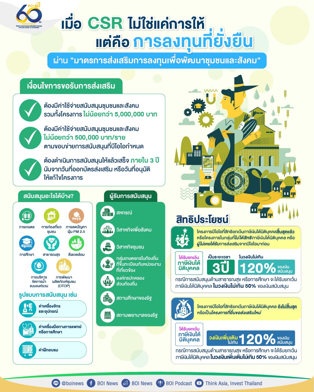 บีโอไอเชื่อมั่นว่าการยกระดับขีดความสามารถให้ชุมชนเกิดความเข้มแข็ง จะเป็นฟันเฟืองสำคัญที่นำไปสู่ความมั่นคงของเศรษฐกิจไทยในระยะยาว จึงส่งเสริมการลงทุนผ่านการให้สิทธิประโยชน์แก่ภาคธุรกิจเมื่อมีการลงทุนทำ CSR ผ่าน "มาตรการส่งเสริมการลงทุนเพื่อพัฒนาชุมชนและสังคม" เพื่อช่วยลดข้อจำกัดด้านการลงทุน และขับเคลื่อนธุรกิจไปสู่การเติบโตอย่างยั่งยืนไปพร้อมกัน